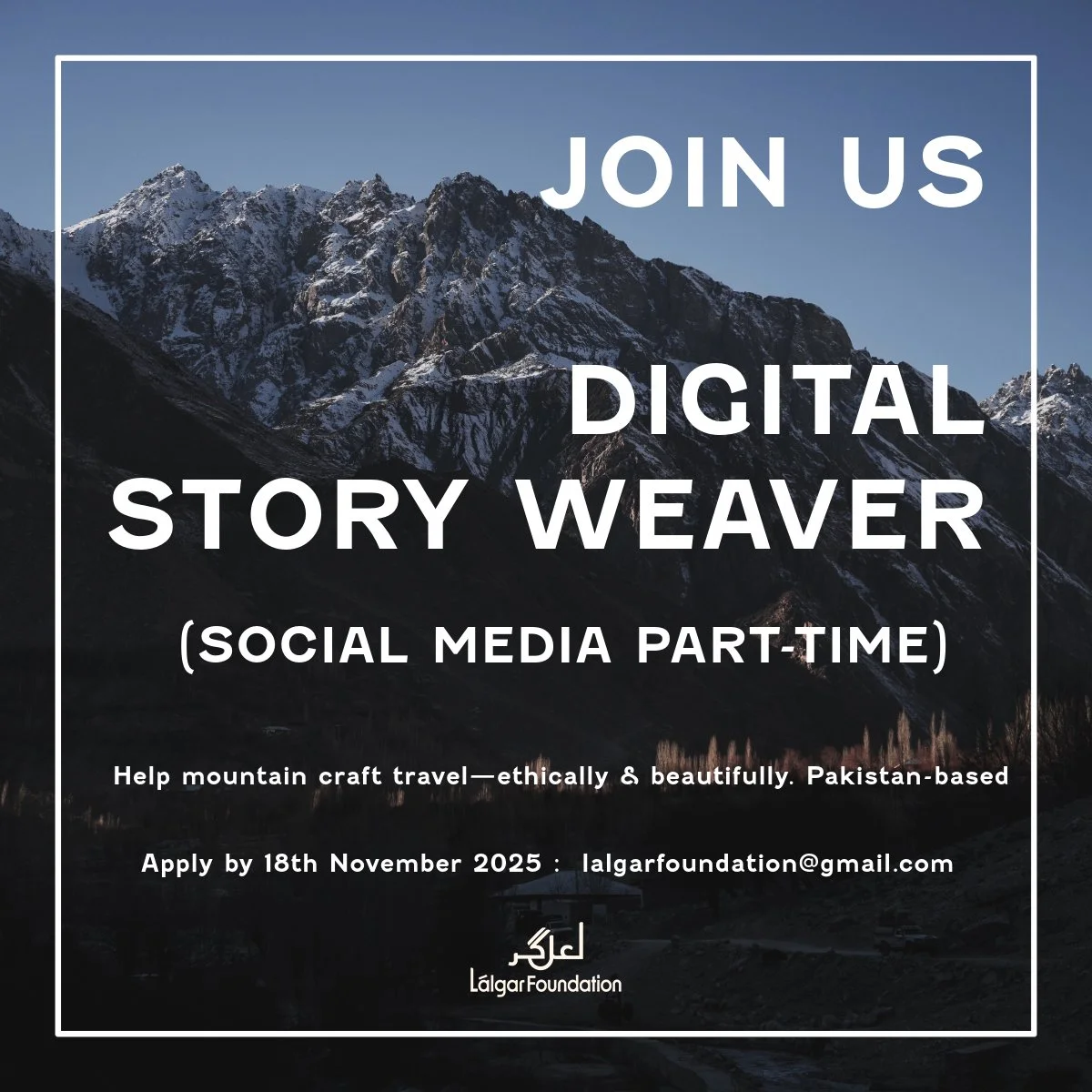 Làlgar Foundation is a mountain lab where loom, library & listening meet. We work with artisans in Chitral to revive Shu (Chitrali wool), embroidery, literature, music, and community archives. We’re seeking a part-time Social Media Assistant to carry these stories further—ethically and beautifully.